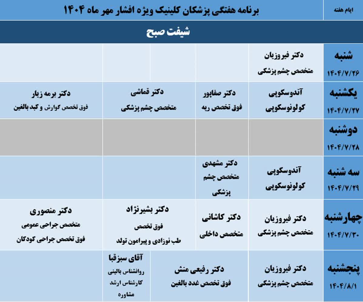 ⬇️ برنامه هفتگی پزشکان کلینیک ویژه افشار دزفول | شیفت صبح