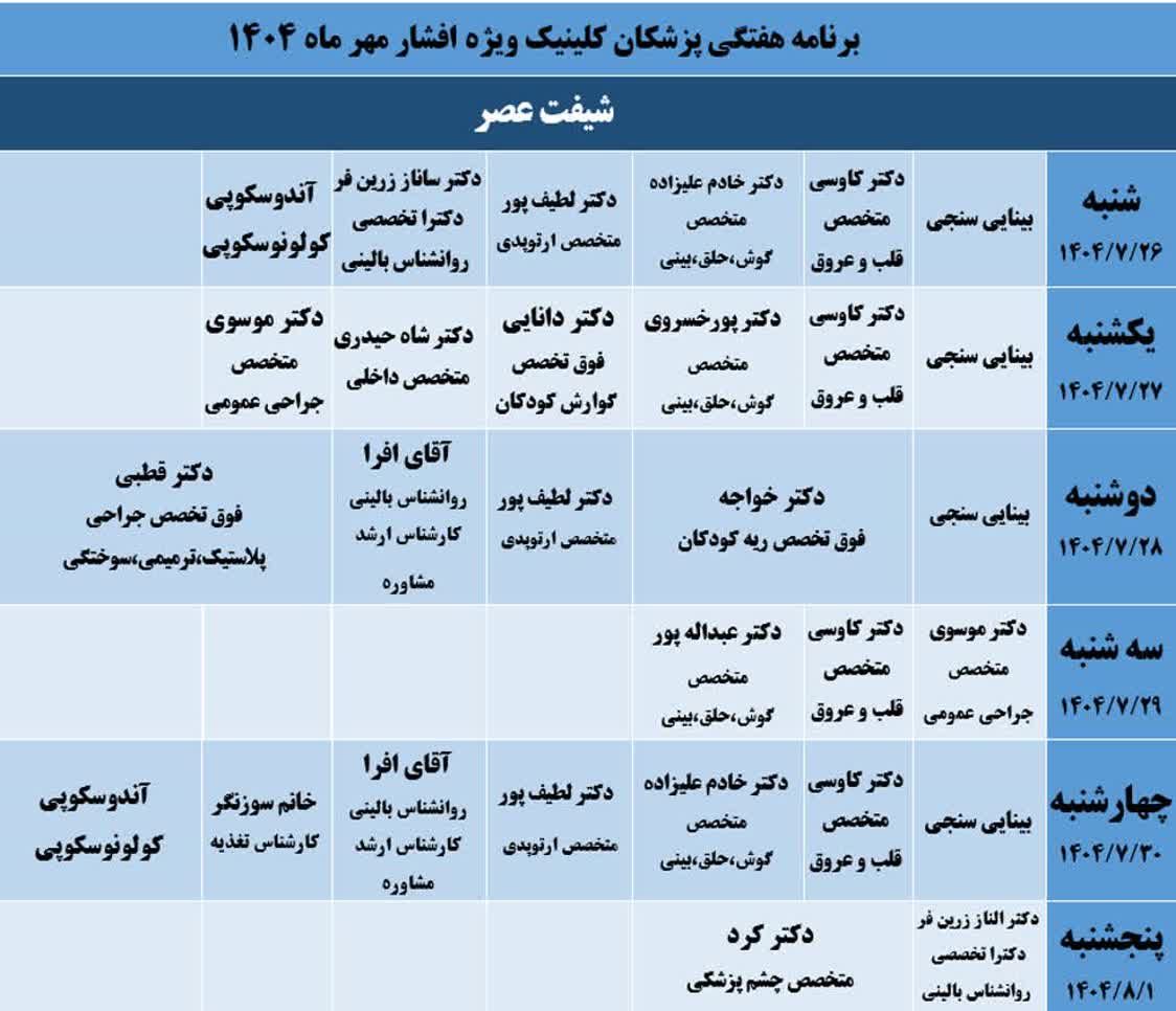 ⬇️ برنامه هفتگی پزشکان کلینیک ویژه افشار دزفول | شیفت عصر